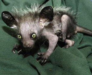 To put it bluntly, most people wouldn't consider an aye-aye attractive. Since many of them come in beautiful color combinations, there are many who chose to make them pets. They have large eyes and a long bushy tail just like a squirrel, but with forward slanting incisors. An aye-aye's teeth are constantly growing and are only kept in check by the chewing they do in search of food. When they are young, their fur can range from grey to black with lighter colored stripes. Once they start to age, however, their fur turns more of a single color. Their outer fur tends to darken while their underside and chest often turns white. Their tail is normally the same length as their body. Their forelegs are long and naturally adapted to foraging, but their rear legs are short like a rodent. They have large naked ears and large eyes that give off a yellowish brown tint.